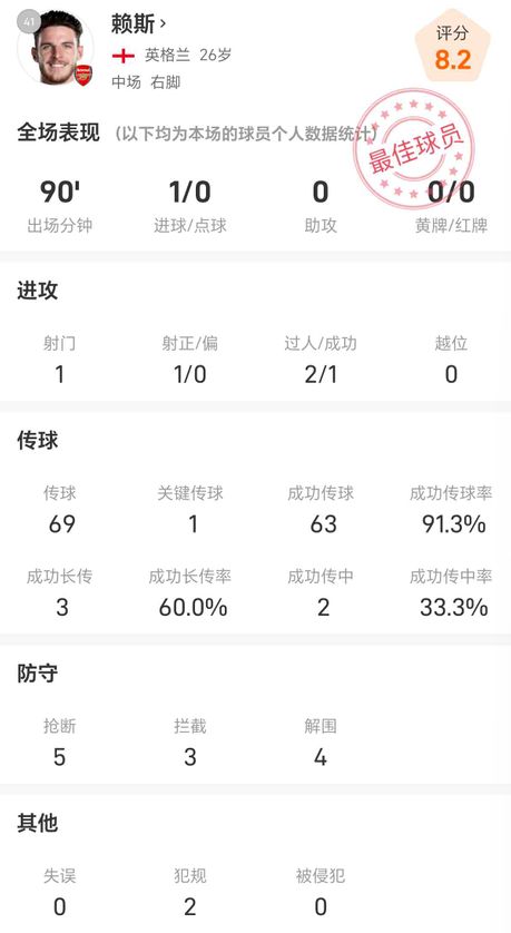 雷速体育11月2日讯 英超第10轮,阿森纳2-0伯恩利,本场比赛,赖斯首发出场,他全场比赛数据如下: